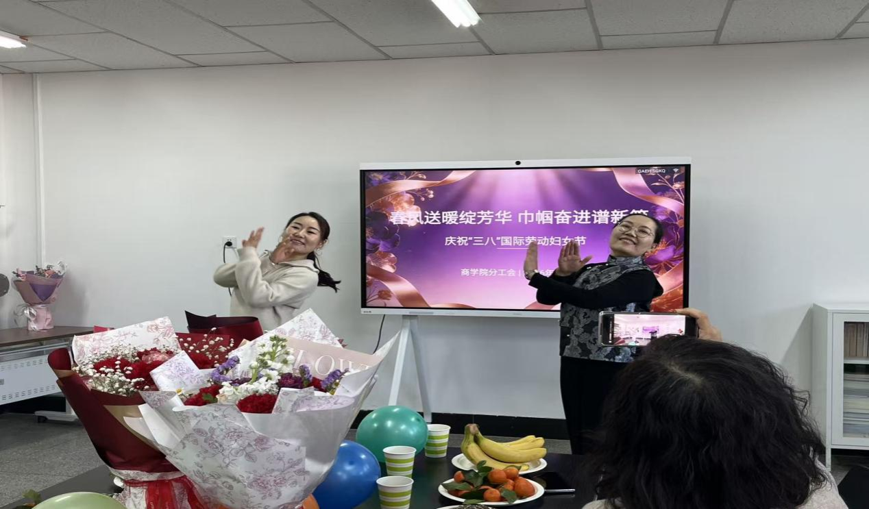 2026年3月5日下午,商学院310会议室洋溢着欢声笑语,一场温馨而热烈的“三八”妇女节庆祝活动在此举行。学院精心布置了会场,准备了娇艳的鲜花、甜美的蛋糕、新鲜的水果香蕉以及瓜子香茶,营造出浓浓的节日氛围。