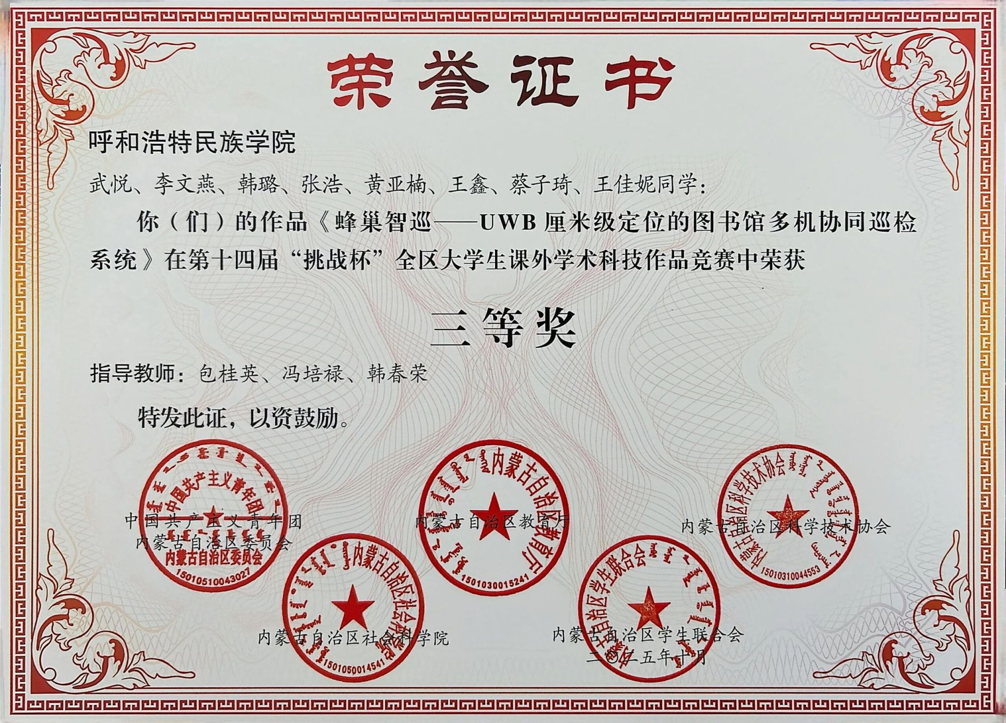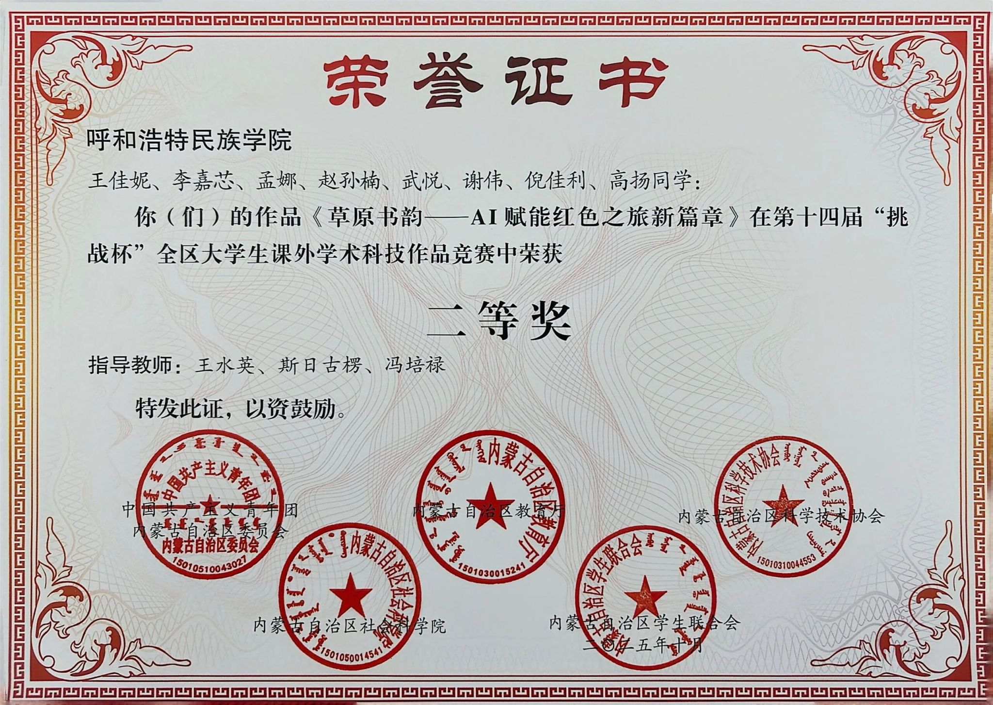 在决赛中,我院参赛团队凭借扎实的学术功底与创新实践能力,从全区高校众多项目中脱颖而出,其中《草原书韵——AI赋能红色之旅新篇章》项目荣获二等奖;《灵犀智校中枢——新工科时代数智化践行者》、《星河智轨——云端协同的AI物流决策系统》《羽翼识踪》《蜂巢智巡-UWB厘米级定位的图书馆多机协同巡检系统》等4个项目荣获三等奖。获奖项目涉及人工智能算法优化、新能源材料研发等多个前沿领域,聚焦社会需求与技术突破,既体现了对学科理论的深度思考,又展现了将科研成果转化为实际应用的能力。