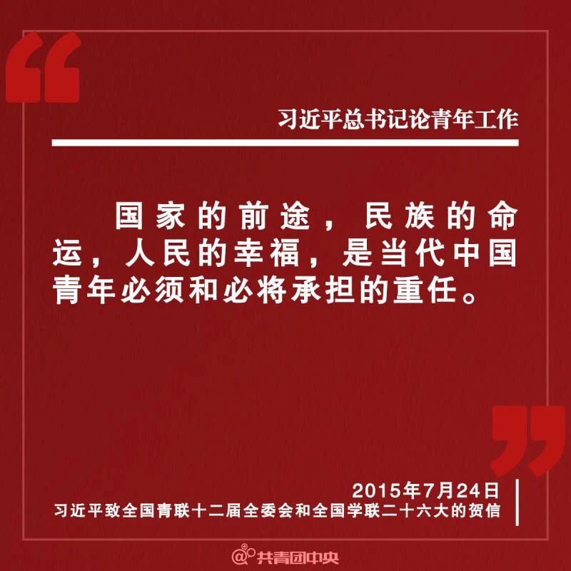 2015年7月24日,习近平总书记在致全国青联十二届全委会和全国学联二十六大的贺信中说:“国家的前途,民族的命运,人民的幸福,是当代中国青年必须和必将承担的重任。一代青年有一代青年的历史际遇。我们的国家正在走向繁荣富强,我们的民族正在走向伟大复兴,我们的人民正在走向更加幸福美好的生活。当代中国青年要有所作为,就必须投身人民的伟大奋斗。同人民一起奋斗,青春才能亮丽;同人民一起前进,青春才能昂扬;同人民一起梦想,青春才能无悔。”