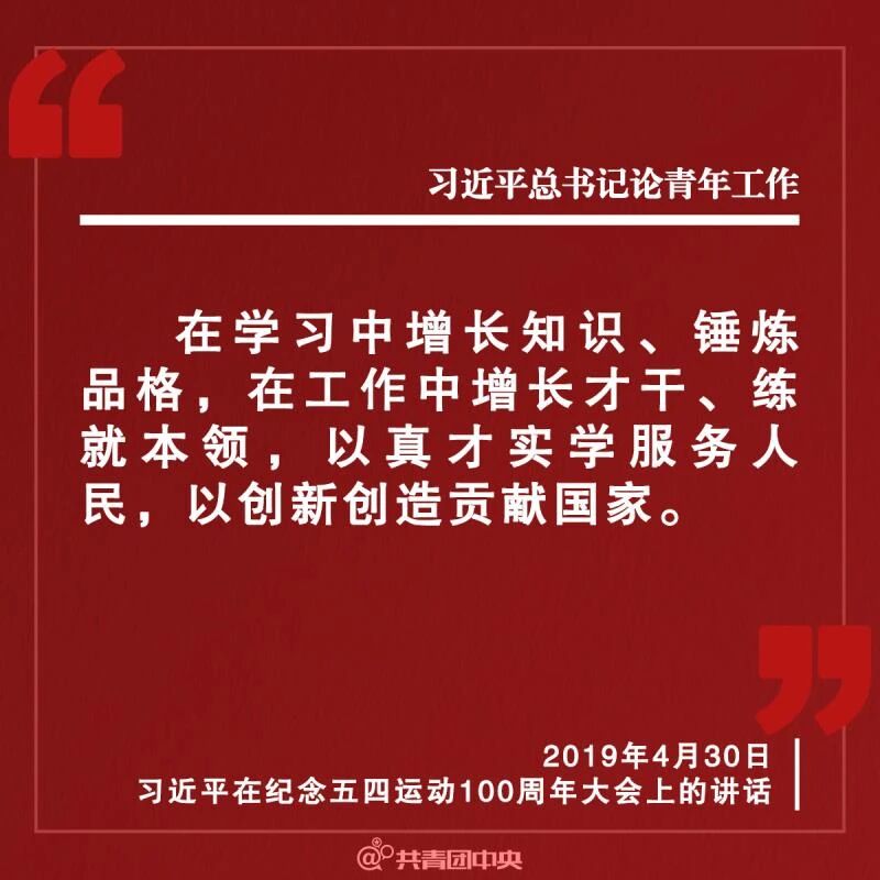 “在革命、建设、改革各个历史时期,中国共产党始终高度重视青年、关怀青年、信任青年,对青年一代寄予殷切期望。中国共产党从来都把青年看作是祖国的未来、民族的希望,从来都把青年作为党和人民事业发展的生力军,从来都支持青年在人民的伟大奋斗中实现自己的人生理想。”2013年5月4日,习近平总书记在同各界优秀青年代表座谈时指出。