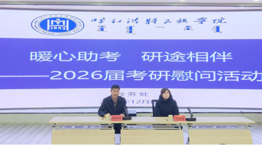 继为2026届考研班学生提供免费考研英语、考研政治冲刺辅导后,为鼓舞考研学子士气,帮助大家以良好心态迎接即将到来的考试,12月8日晚,教务处开展“暖心助考,研途相伴”考研慰问活动。教务处负责同志、考研班班主任及2026届考研班学生参与活动。活动由教务处副处长青格乐图主持并讲话。
