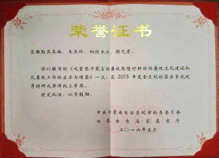 近日,自治区纪委下发《关于表彰2015年度全区纪检监察系统优秀调研成果的通报》(内纪办通报[2016]第15期),对全区纪检监察优秀调研成果进行通报表彰,我校纪委课题组编写的调研报告《成吉思汗的廉政思想对新时期廉政文化建设和反腐败工作的启示与借鉴》被评为三等奖。