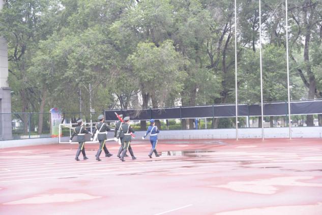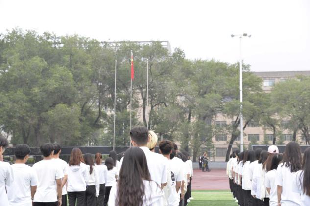阳光冉冉升起,朝气蓬勃的国旗班成员迈着铿锵有力的步伐向着升旗台缓缓走来。伴随着庄严雄壮的《义勇军进行曲》,鲜艳的五星红旗在晨雾中冉冉升起,高高飘扬在校园上空。在场师生面向国旗行注目礼,齐唱国歌。