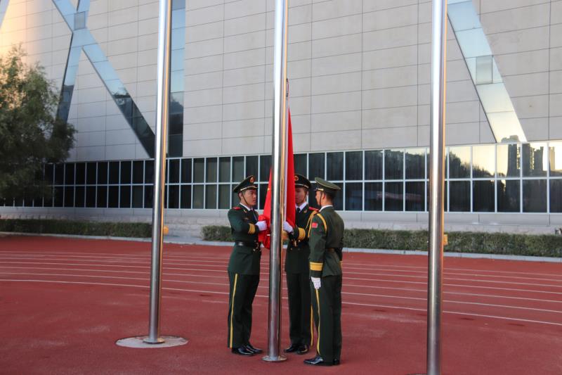 早上7:00,国旗护卫队穿戴整齐,迈着整齐的步伐,在庄严肃穆的《义勇军进行曲》中,将鲜艳的五星红旗冉冉升起,五星红旗迎风飘扬。