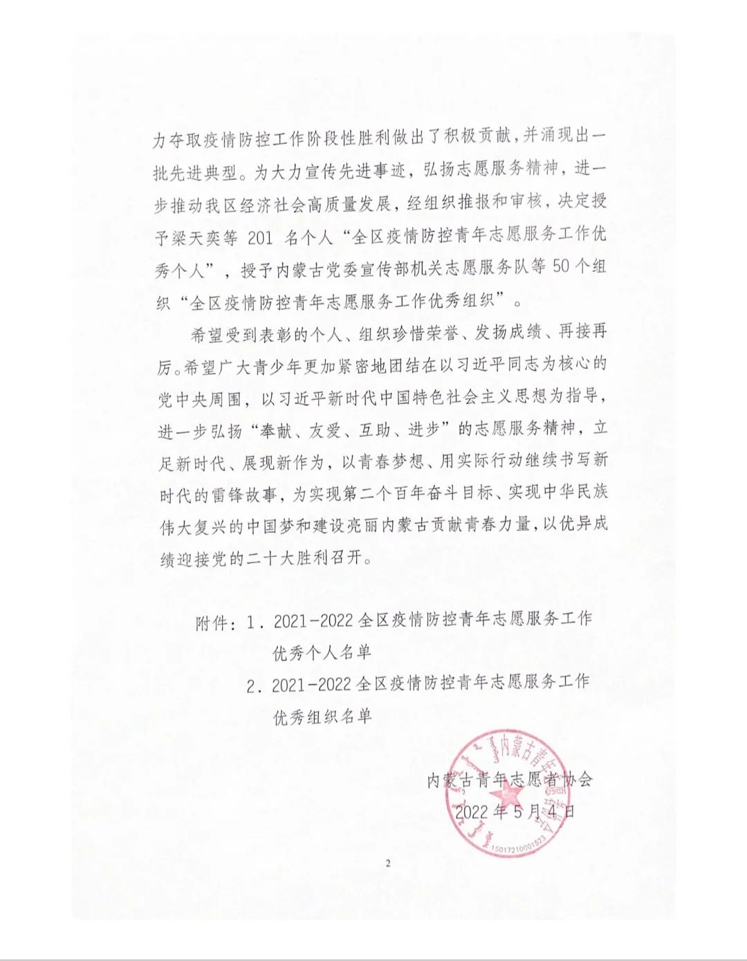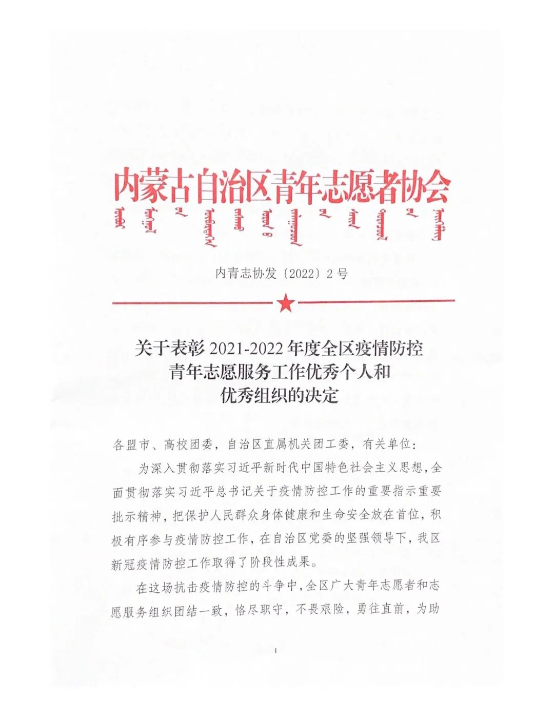 近日,在自治区青年志愿者协会《关于表彰2021-2022年度全区疫情防控青年志愿服务工作优秀个人和优秀组织的决定》中我校志愿者服务队荣获“2021-2022年度全区疫情防控青年志愿服务工作优秀组织”荣誉称号;数学与大数据学院李少波同学荣获“2021-2022年度全区疫情防控青年志愿服务工作优秀个人”荣誉称号。