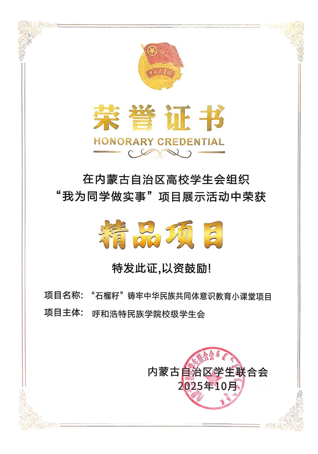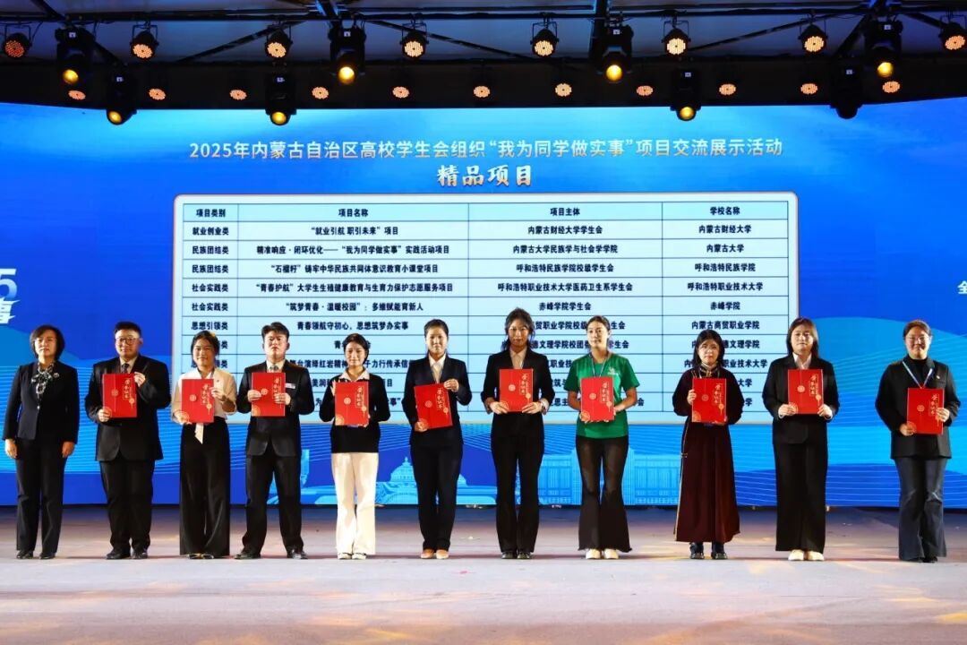 由共青团内蒙古自治区委员会指导,内蒙古自治区学生联合会主办的2025年“我为同学做实事”项目交流展示活动于10月19日至20日在内蒙古建筑职业技术大学举行。全区58所高校共申报186个项目,经过严格评审,最终37所高校的50个项目入围展示活动,并评选出20个“精品项目”、30个“优秀项目”。我校团委推选的《“石榴籽”铸牢中华民族共同体意识教育小课堂》项目,荣获“精品项目”。