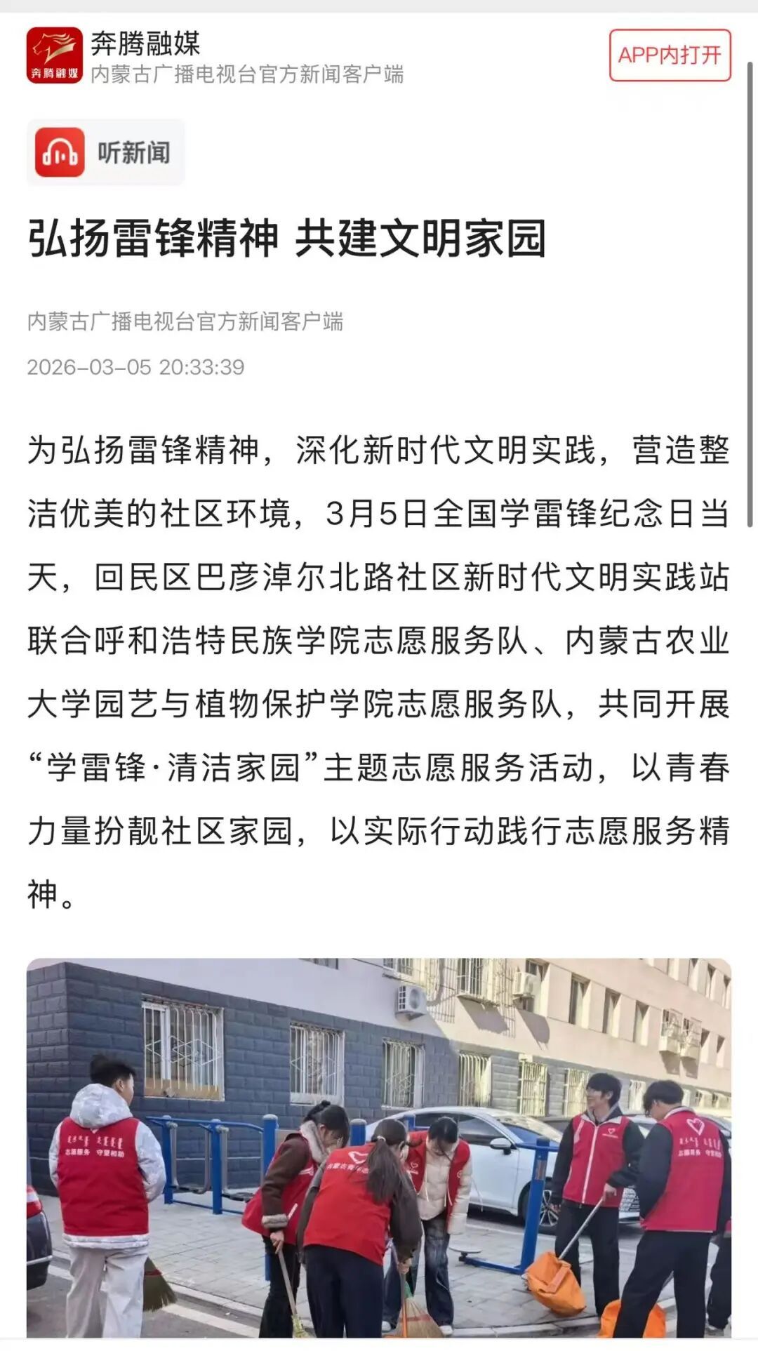 活动期间,我校志愿者积极开展社区环境整治、敬老助老等志愿服务,用实际行动践行奉献、友爱、互助、进步的志愿精神。我校4 名志愿者应邀参加内蒙古电台 “我爱公益” 节目直播采访,相关活动获奔腾融媒内蒙古广播电视台官方新闻客户端专题报道。