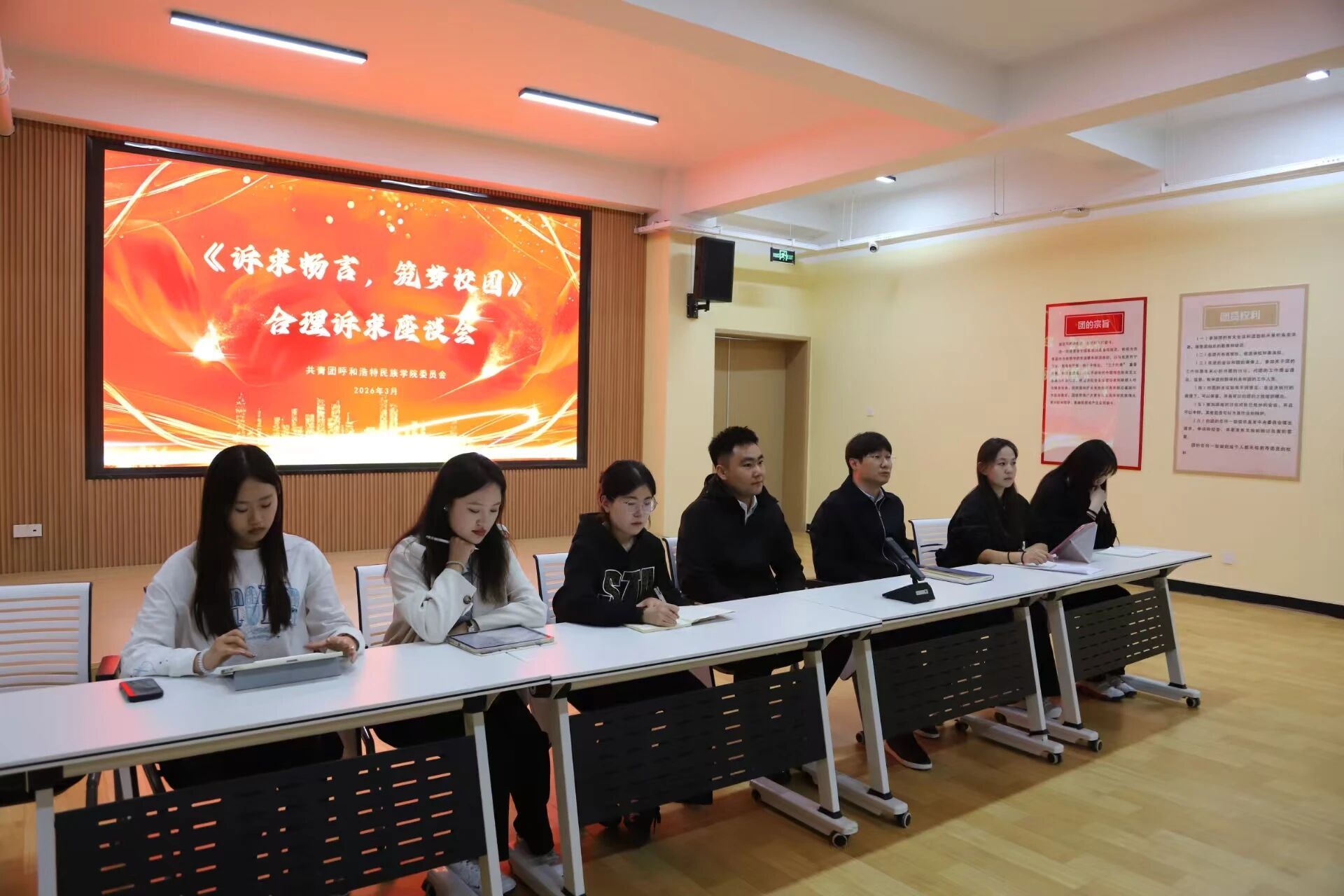 为进一步畅通学生诉求表达渠道,切实解决学生学习生活中的实际问题,3月26日,我校团委举办“诉求畅言,筑梦校园”合理诉求座谈会。校团委书记张子涵、组织部负责人青合乐,校学生会成员及学生代表参会。