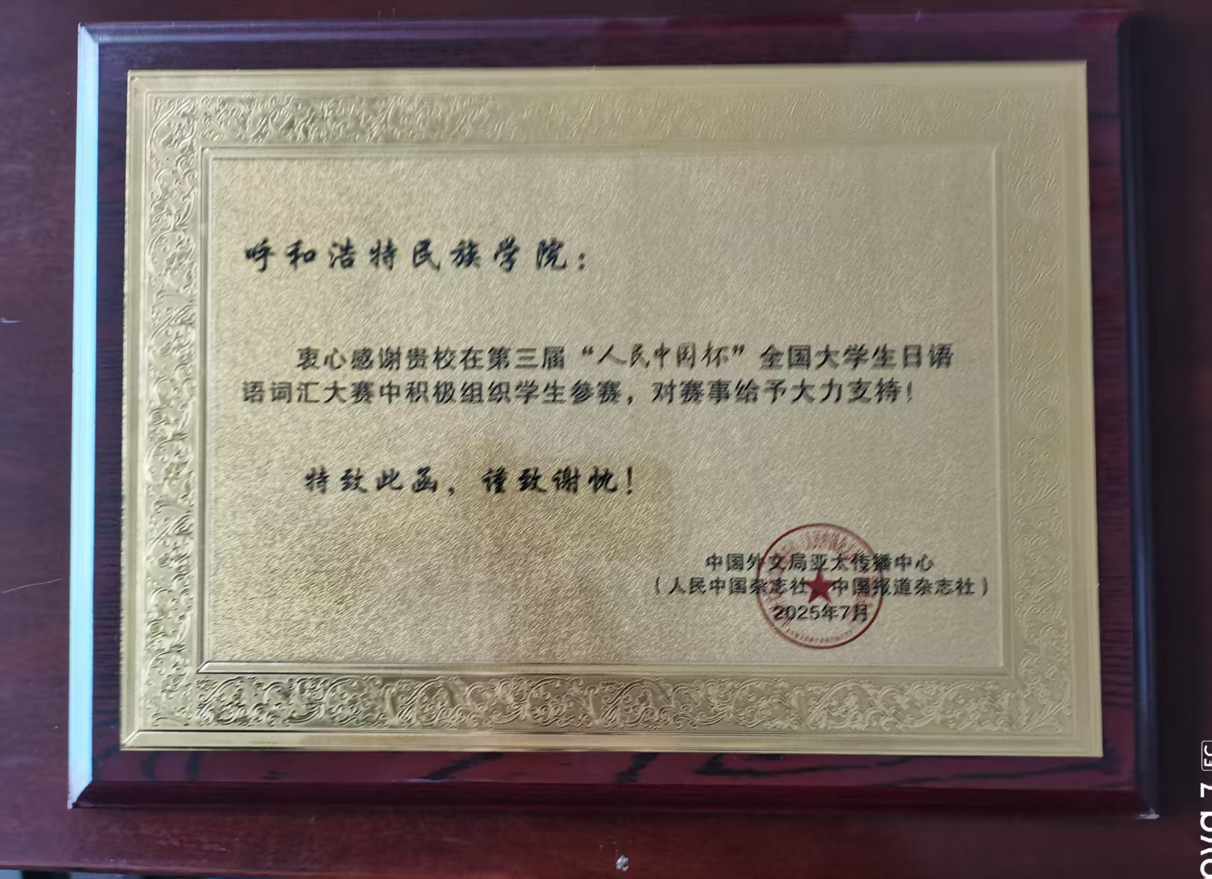 近日,第三届“人民中国杯”全国大学生日语词汇大赛结果揭晓,我校22级、24级日语班学子凭借扎实的语言功底与出色的临场发挥斩获佳绩,22名参赛学生在比赛中全部获奖,同时呼和浩特民族学院外国语学院荣获大赛优秀组织奖。