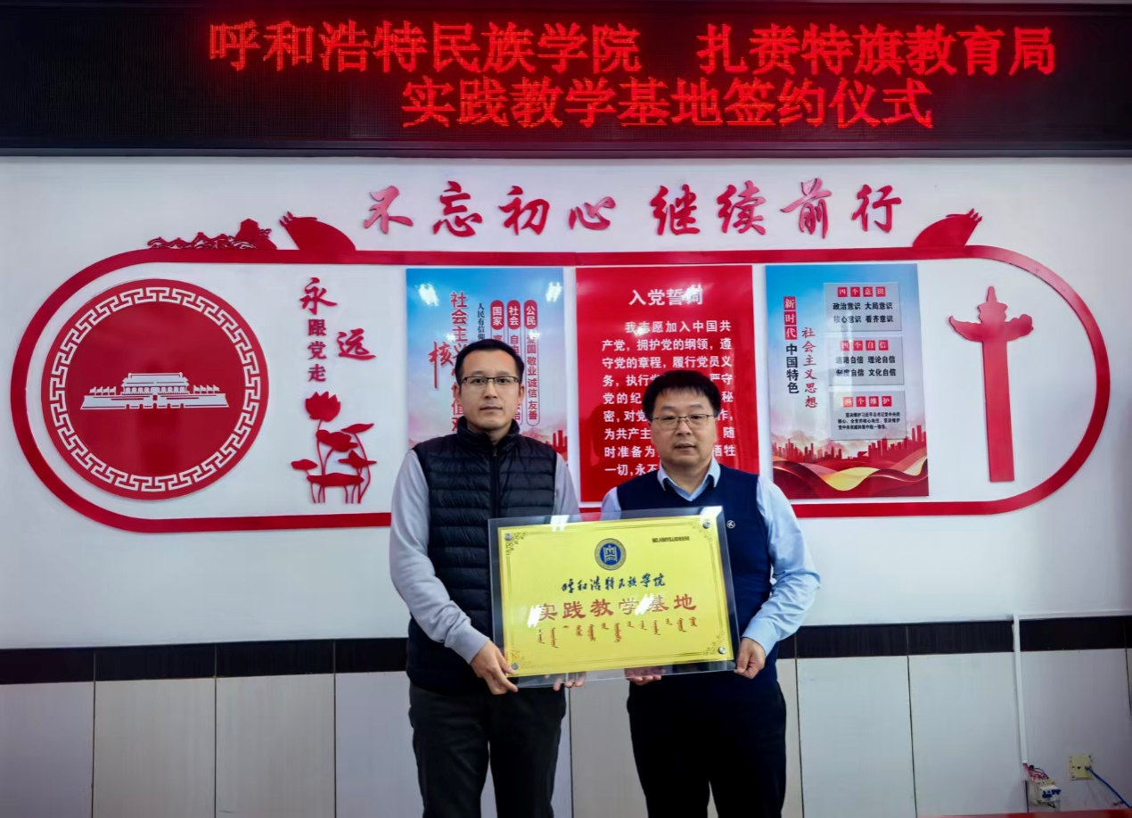 为深化实践教学改革、创新人才培养模式,11月24日,我校外国语学院与兴安盟扎赉特旗教育局在扎赉特旗隆重举行“实践教学基地”挂牌仪式。外国语学院院长秦红喜、党政办公室主任胡日查毕力格等一行出席活动;扎赉特旗教育局副局长孙胜利、副局长朱满达热情接待并全程参与。