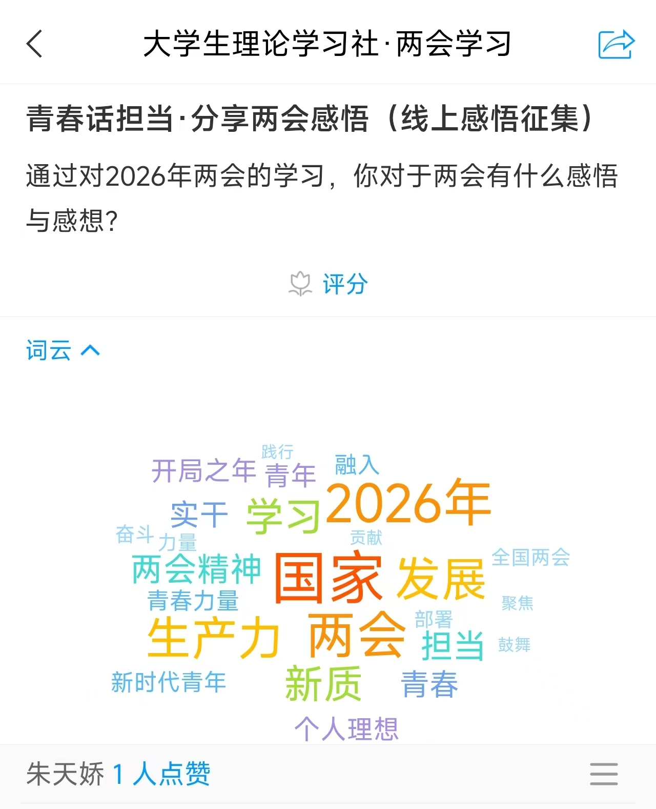 此次线上系列活动累计吸引466人次参与,超300人参与其中,成功以赛促学夯实了学生的两会理论知识基础,也通过感悟征集推动学生从“学两会”向“悟两会”“践两会”转变,有效增强了青年学子的家国情怀与责任担当。活动依托线上平台打破时空限制,让更多学子参与到两会精神学习中,不仅营造了浓厚的校园理论学习氛围,更引导青年学子将个人成长与国家发展大局相结合,为后续校园思想政治理论学习走深走实奠定了良好基础。